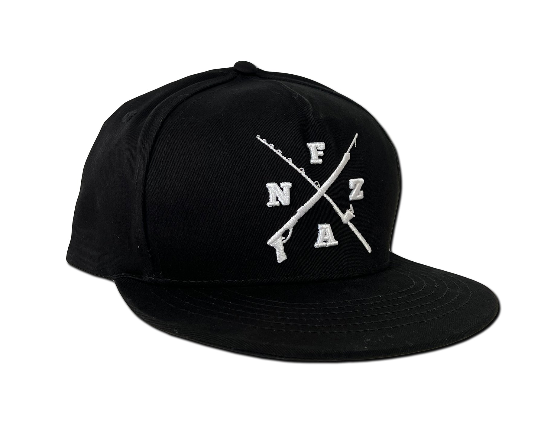 One size fits all flat peak snapback cap. FANZ cross emblem completed with raised embroidery and Fishing & Adventure script design on under brim.